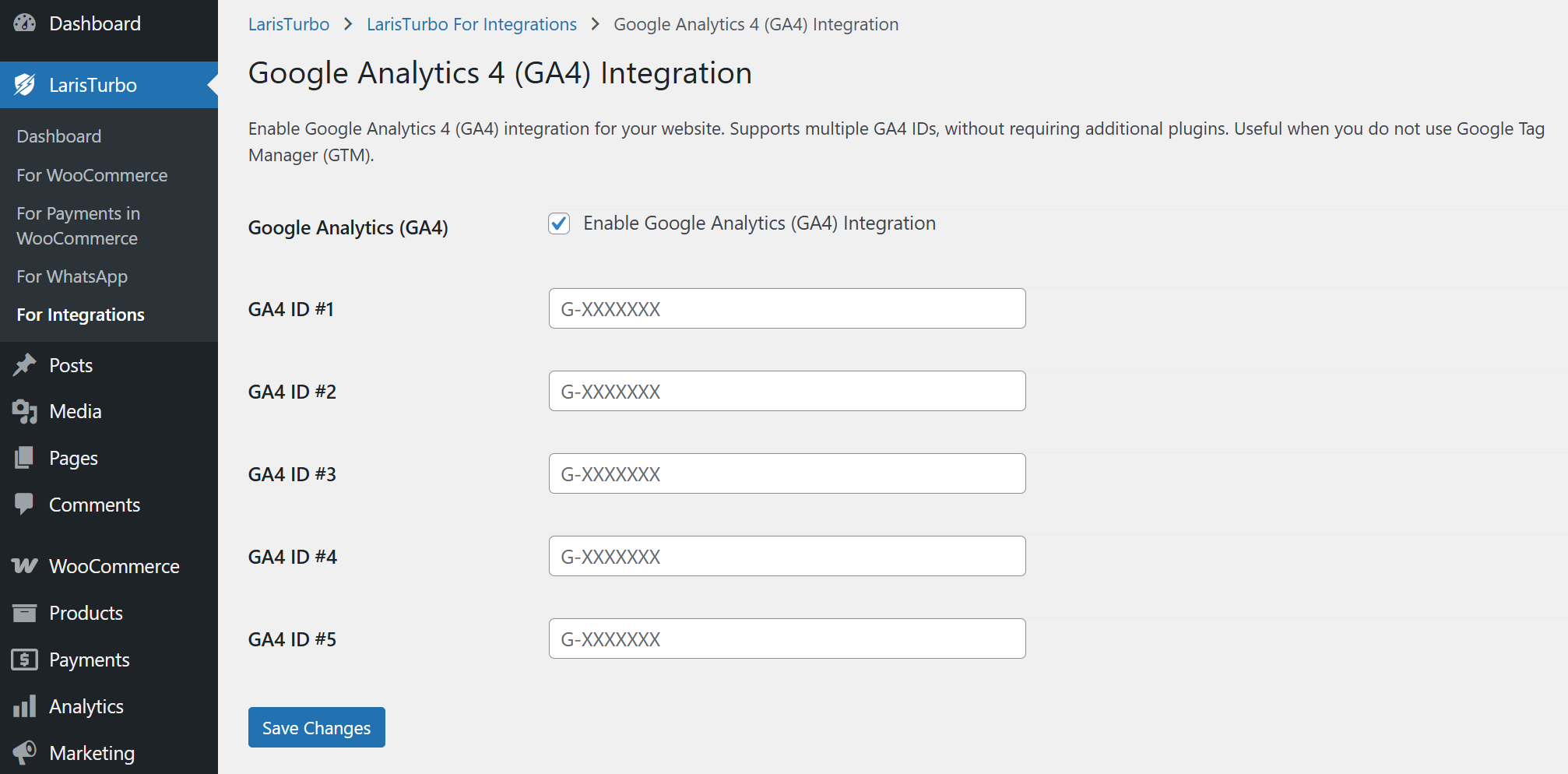 Masuk ke dalam LarisTurbo > For Integrations > Google Analytics 4 (GA4) Integration