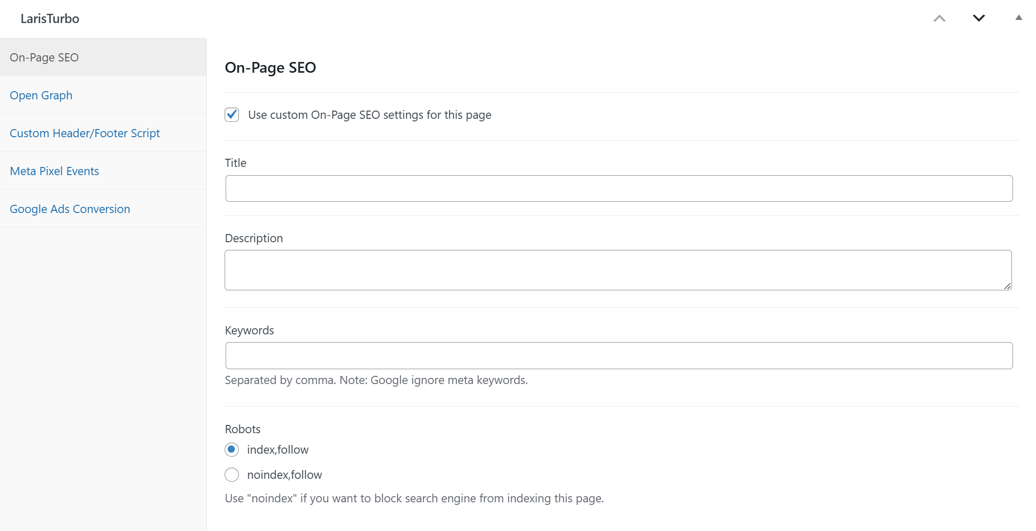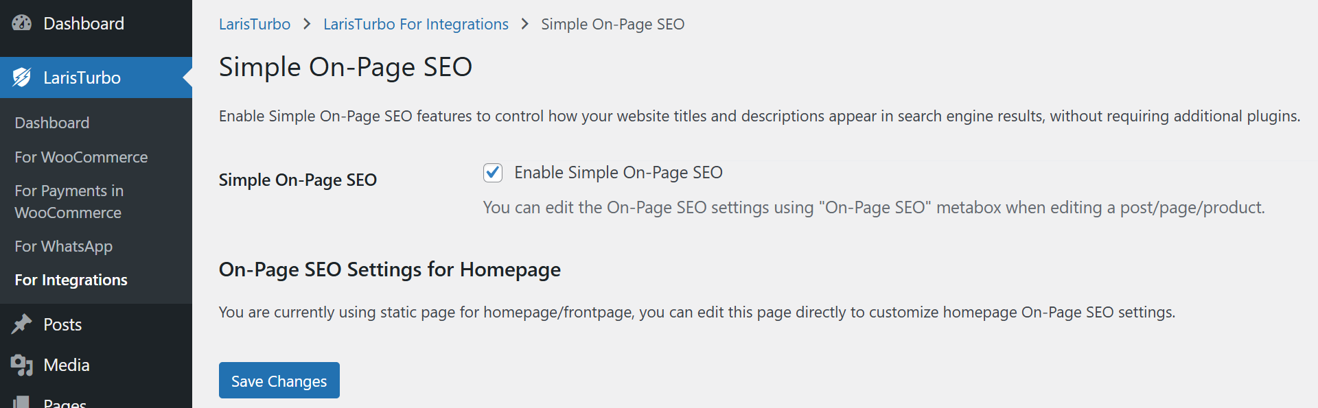 Masuk ke dalam LarisTurbo > For Integrations > Simple On-Page SEO