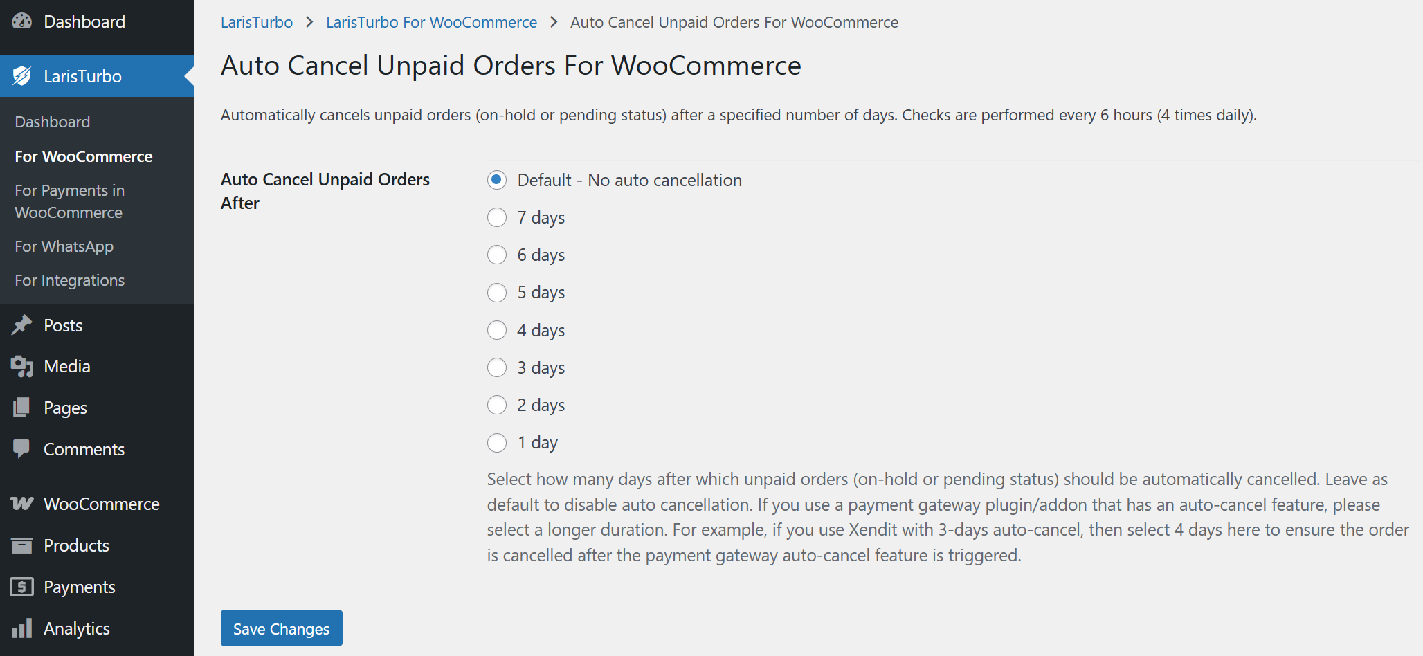 Masuk ke dalam LarisTurbo > For WooCommerce > Auto Cancel Unpaid Orders For WooCommerce