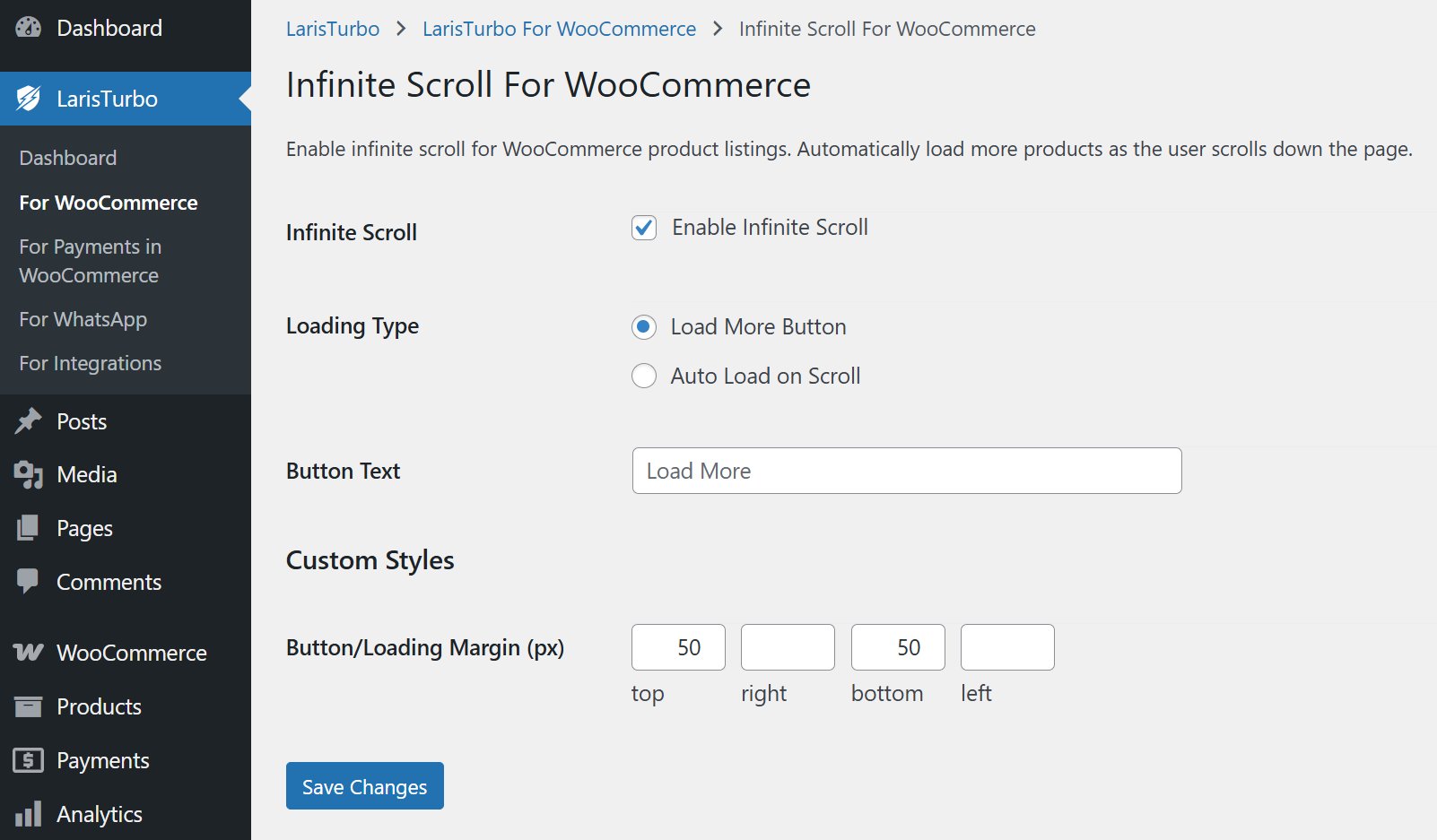 Masuk ke dalam LarisTurbo > For WooCommerce > Infinite Scroll For WooCommerce