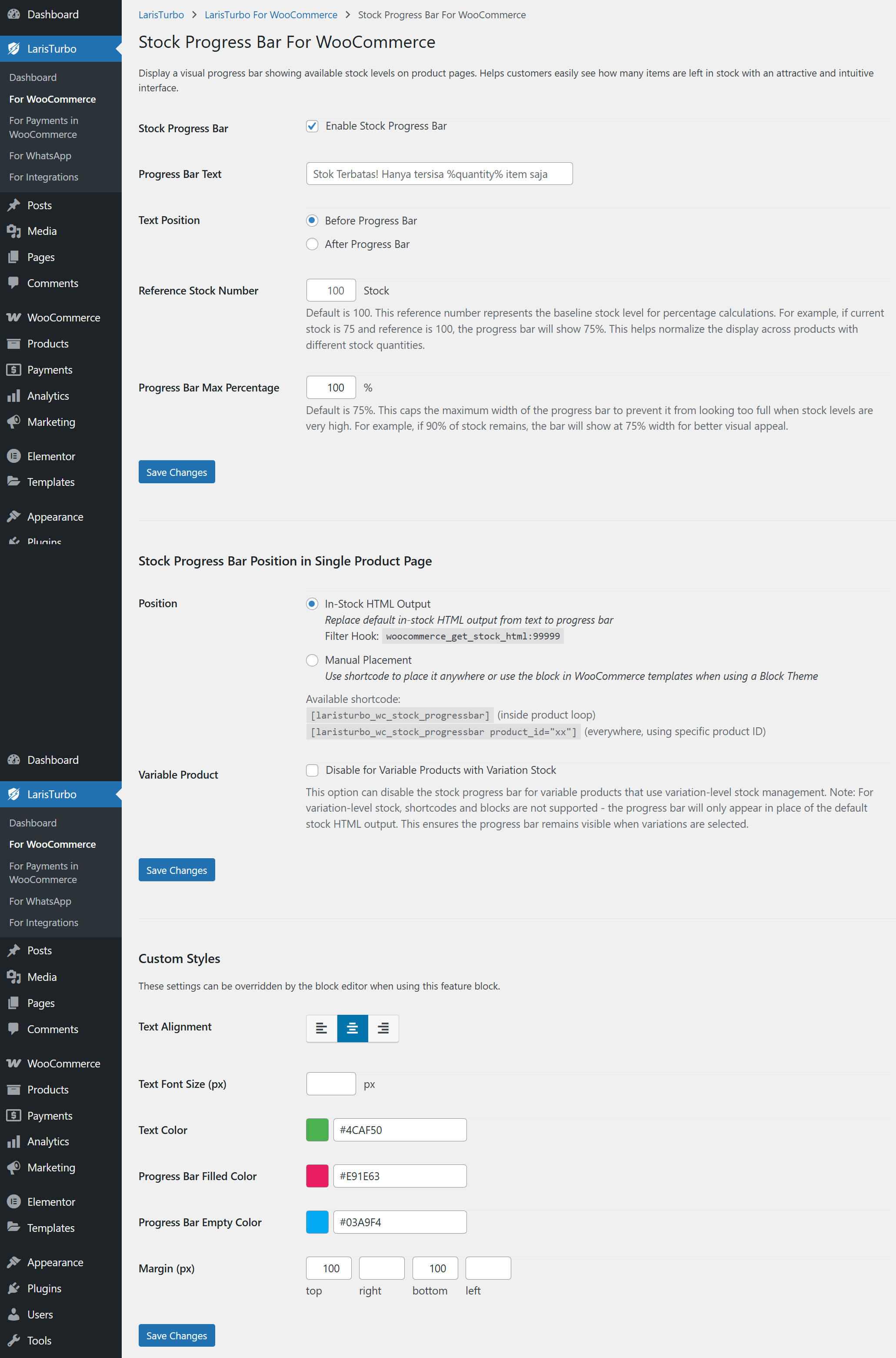 Masuk ke dalam LarisTurbo > For WooCommerce > Stock Progress Bar For WooCommerce