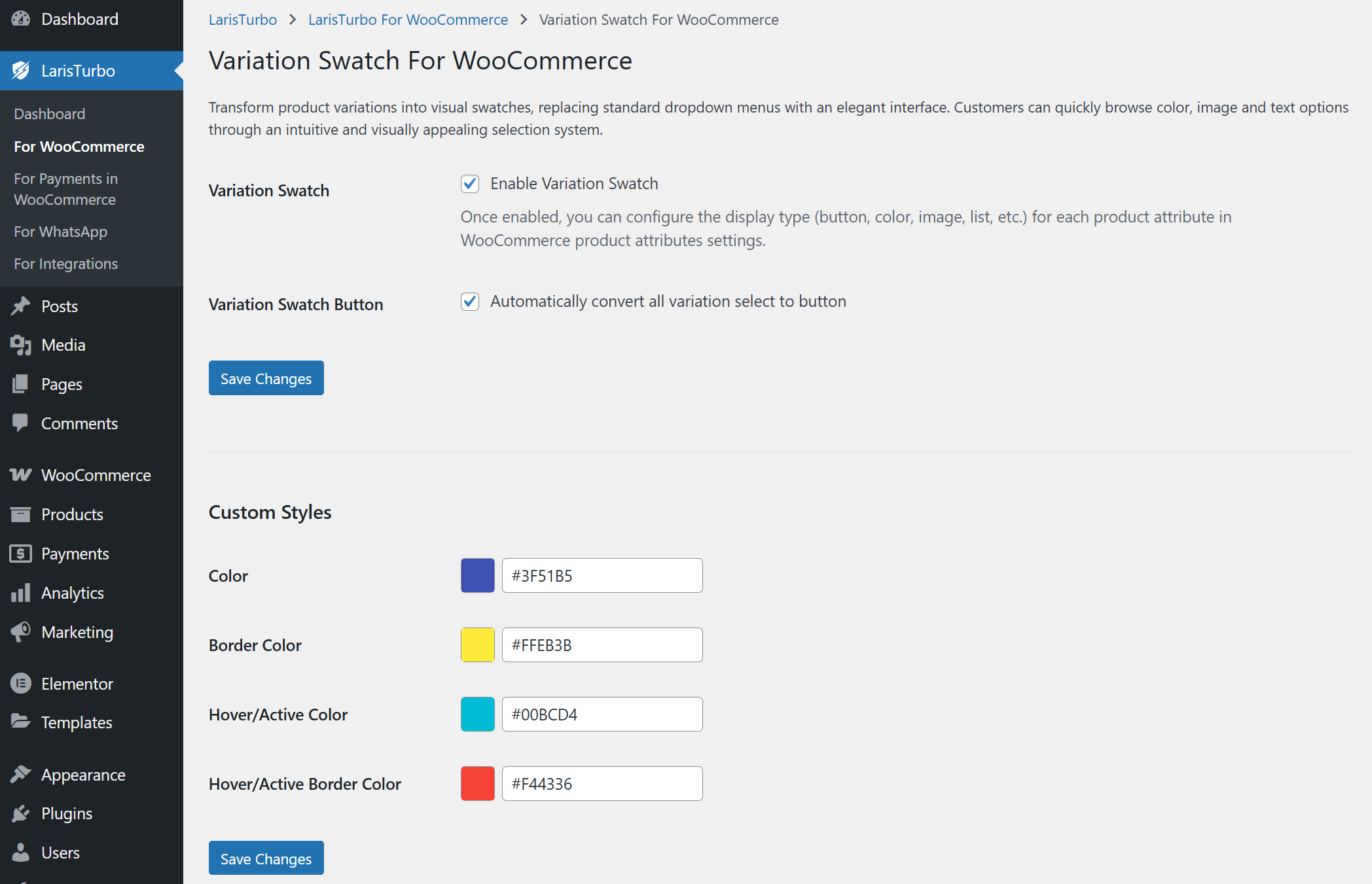 Masuk ke dalam LarisTurbo > For WooCommerce > Variation Swatch For WooCommerce