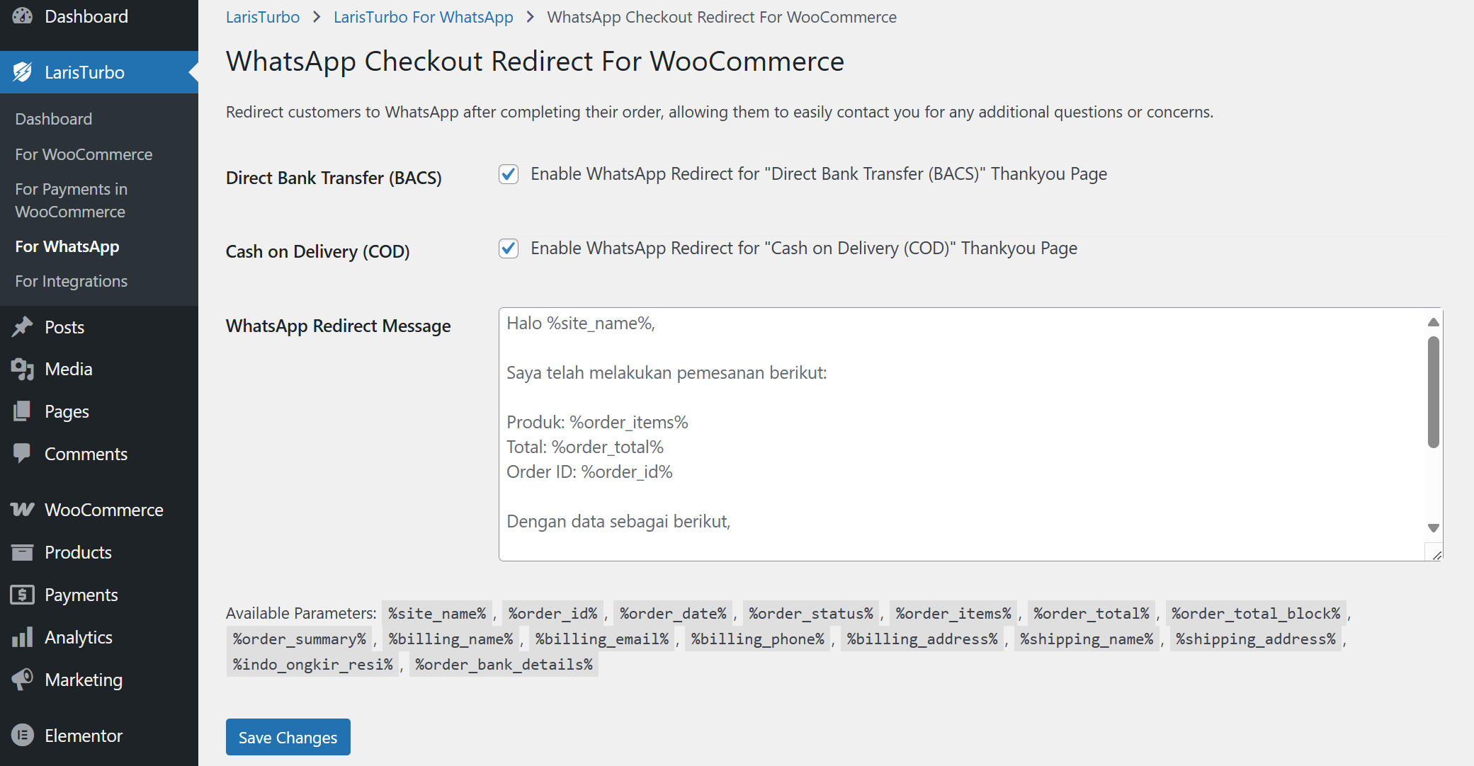 Masuk ke dalam LarisTurbo > For WhatsApp > WhatsApp Checkout Redirect For WooCommerce