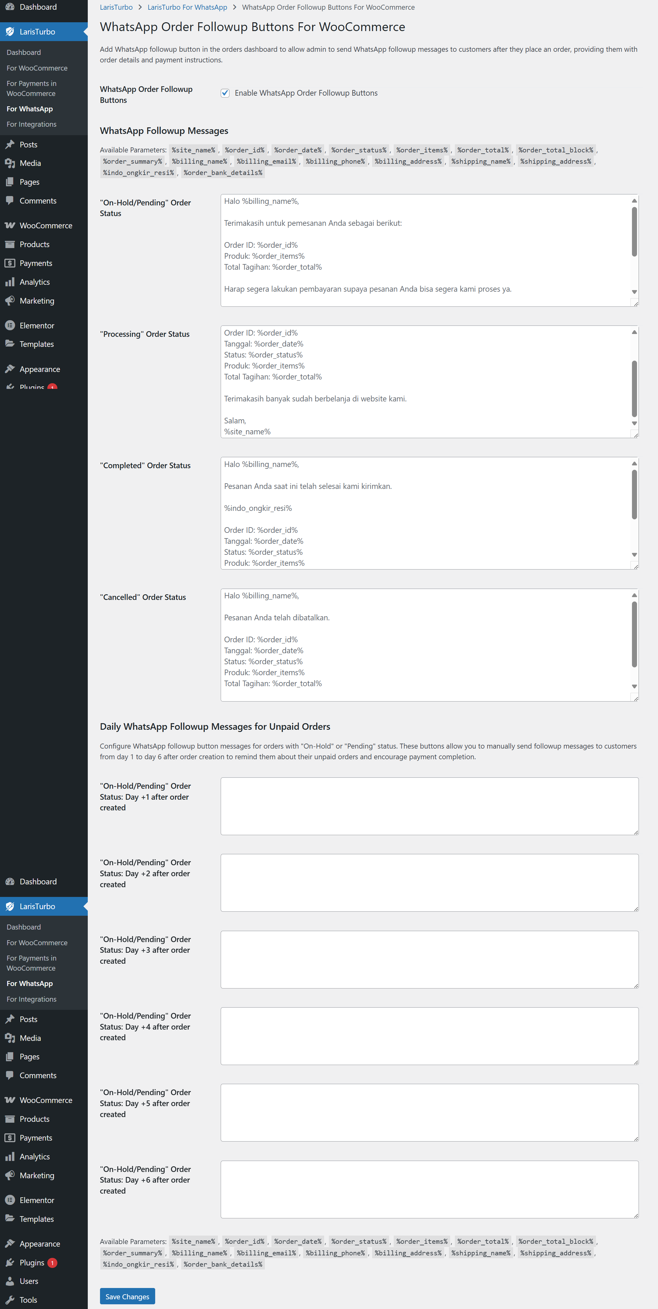 Masuk ke dalam LarisTurbo > For WhatsApp > WhatsApp Order Followup Buttons For WooCommerce