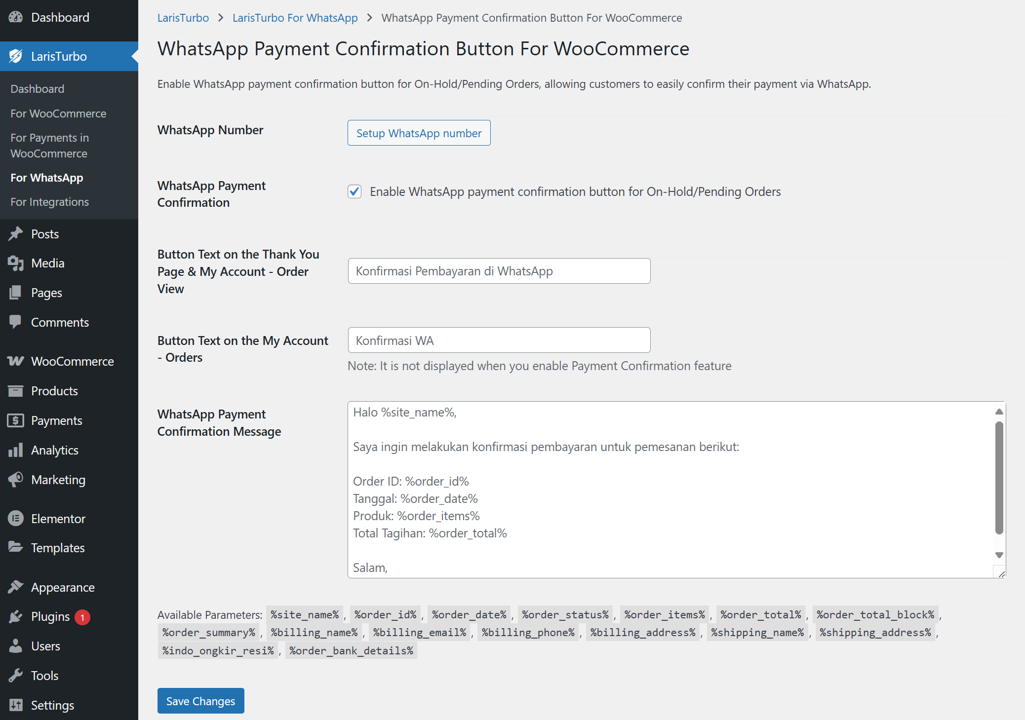 Masuk ke dalam LarisTurbo > For WhatsApp > WhatsApp Payment Confirmation Button For WooCommerce