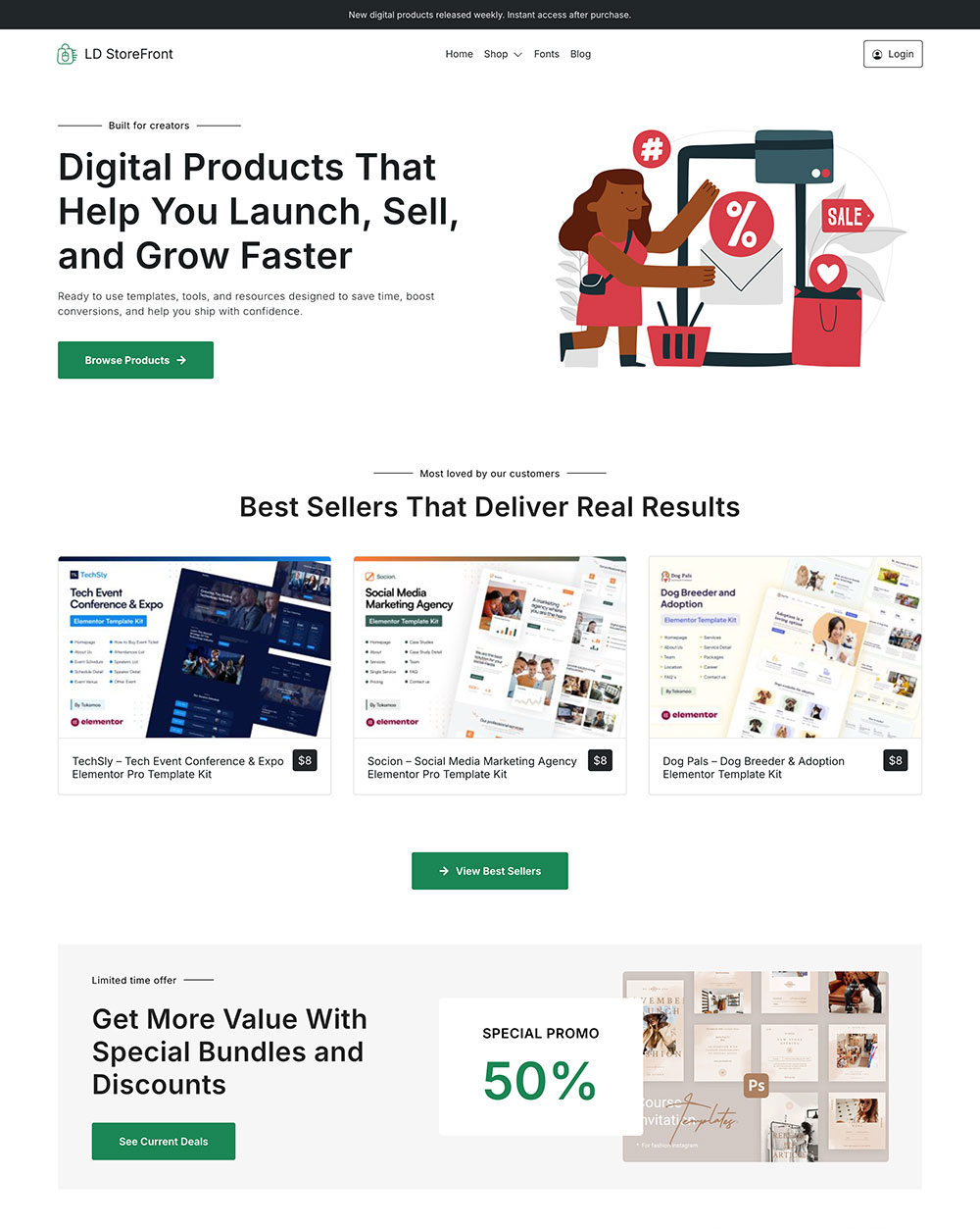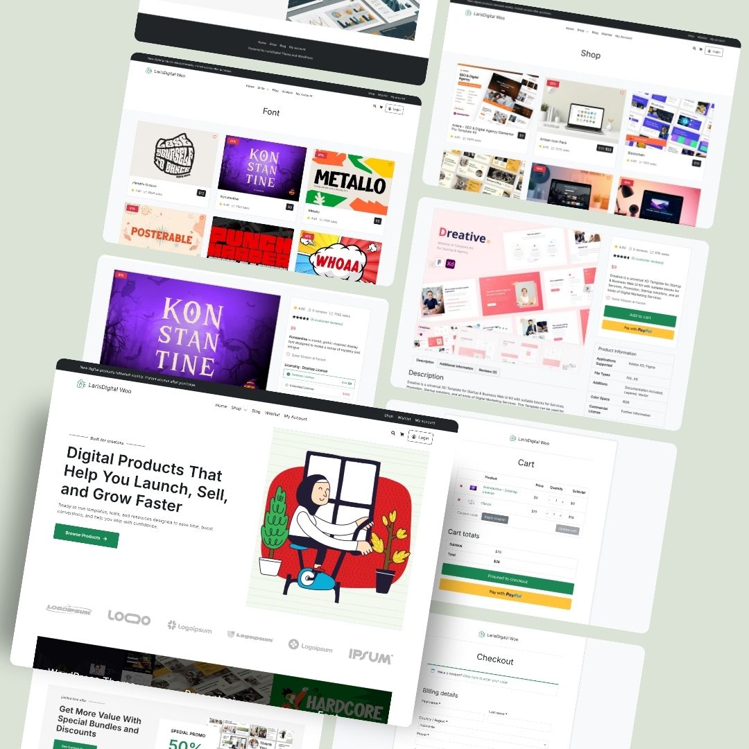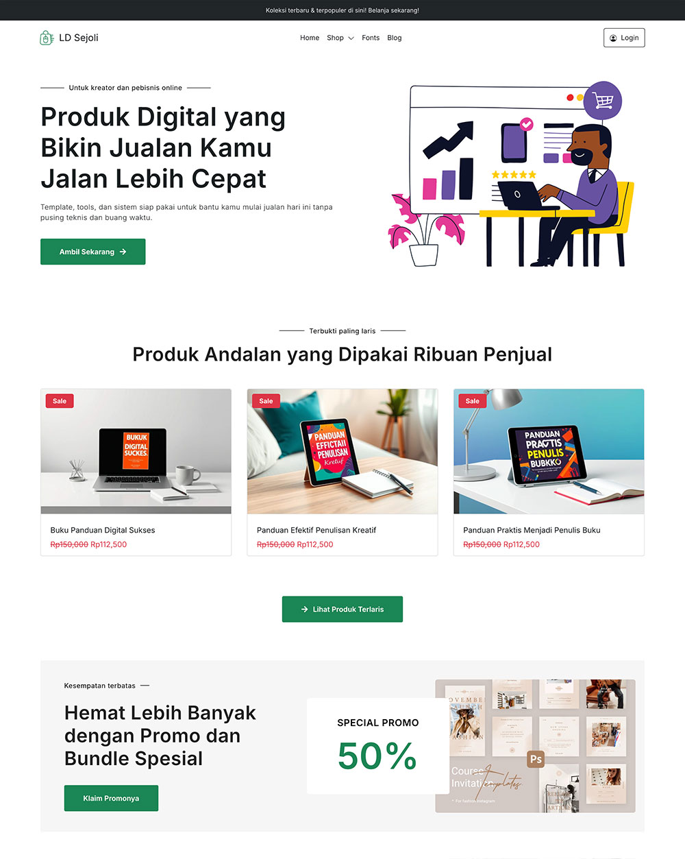 Bangun toko online profesional untuk jualan produk digital, dari font, eBook, video, grafis, kursus online, hingga software. Didesain untuk market global maupun Indonesia, dan mendukung berbagai integrasi seperti WooCommerce, Easy Digital Downloads, TutorLMS, dan lain-lain. Mobile-friendly dan langsung fokus jualan.