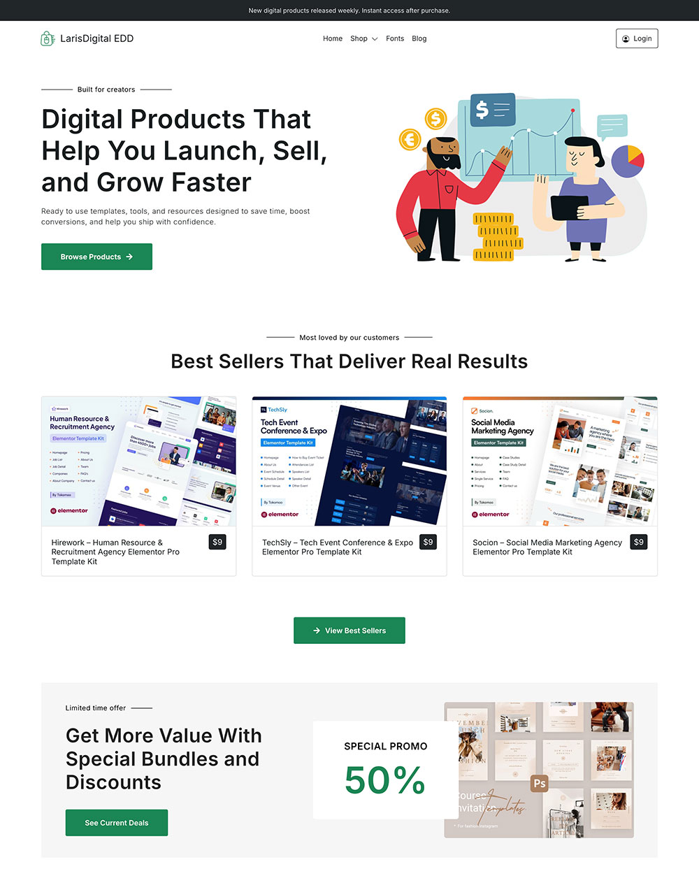 Tidak ingin menggunakan WooCommerce? Anda bisa memilih Easy Digital Downloads (EDD) sebagai solusi yang lebih ringan dan fokus untuk produk digital. Dengan LarisDigital v2, tampilan halaman shop dan single product tetap konsisten seperti versi WooCommerce, dengan perbedaan utama hanya pada proses checkout yang lebih sederhana.