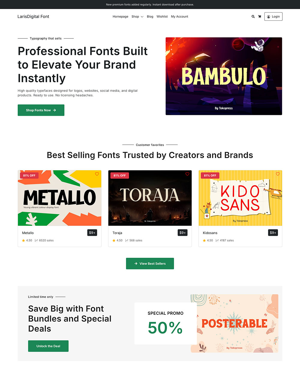 Dilengkapi berbagai fitur tambahan siap pakai dari LarisTurbo for WooCommerce dan LarisFont, mulai dari sales notification hingga fitur khusus produk digital seperti digital checkout dan font tester/preview. Semua sudah terintegrasi langsung di dalam theme, tanpa perlu instal plugin tambahan, sehingga Anda bisa langsung fokus jualan.
