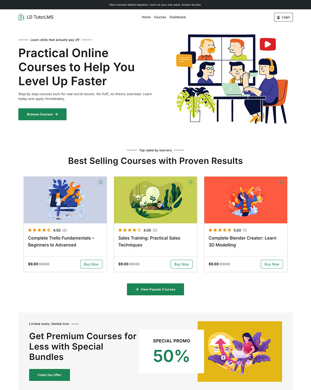 Menjual banyak e-course ala Udemy dengan LarisDigital v2? TutorLMS v3 kini hadir dengan sistem monetisasi bawaan, sehingga Anda tidak perlu lagi plugin tambahan seperti WooCommerce. Anda bisa langsung menjual e-course dengan metode pembayaran seperti PayPal atau transfer manual, semuanya dikelola langsung dari dalam plugin TutorLMS.